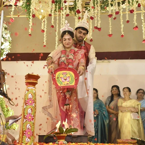 Sumangalam is a unique collective of lady-priests, offering services for various occasions such as Weddings, Marriage Anniversaries, Seniors’ Birthdays, Annaprasana (First-rice) ceremonies, House-warmings, and Rituals for the Departed Souls. Ceremonies are distinctively conducted with a blend of traditional Vedic mantras and live renditions of Rabindrasangeet and Brahmasangeet , performed by eminent artistes. Sumangalam takes a progressive approach to traditional wedding rituals and takes pride in abstaining from the traditional 'Kanyadaan' during wedding rituals with the belief that a daughter should never be seen as a commodity to be given away. Instead, the focus remains on creating a deeply meaningful and inclusive ceremony where all participants can feel spiritually connected. To ensure that everyone understands and appreciates the rituals, Vedic mantras are translated into Bengali, English, and Hindi, tailored to the preferences of the patrons.